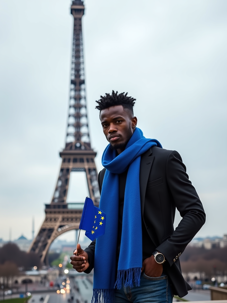 model in front of the iconic Eiffel Tower, wearing a smart casual outfit with European blue scarf, striking a proud pose with a small European flag, Paris cityscape creating a romantic, inspiring atmosphere