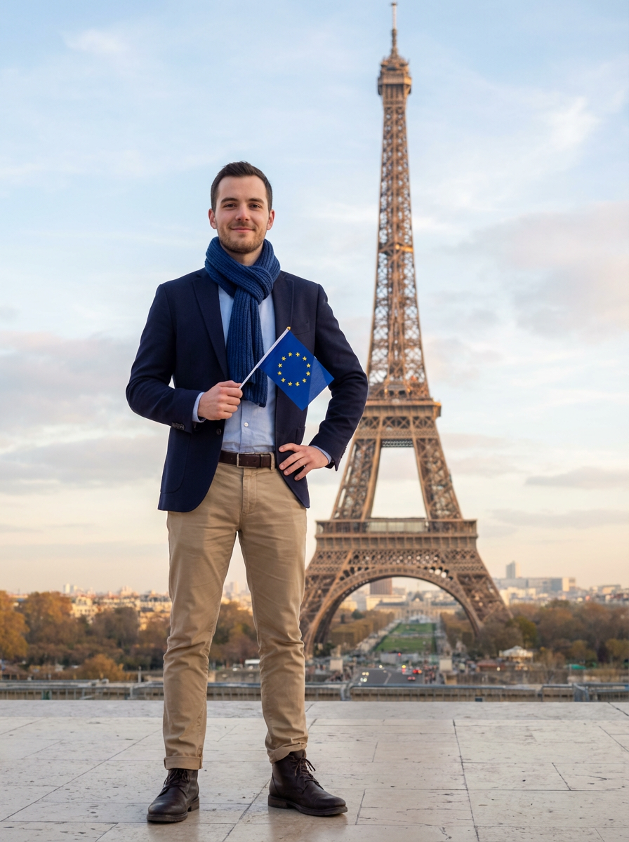 model in front of the iconic Eiffel Tower, wearing a smart casual outfit with European blue scarf, striking a proud pose with a small European flag, Paris cityscape creating a romantic, inspiring atmosphere
