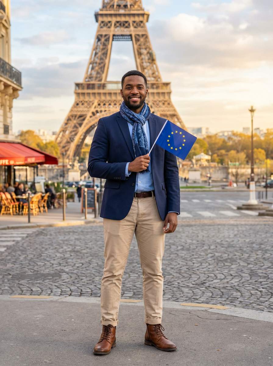 model in front of the iconic Eiffel Tower, wearing a smart casual outfit with European blue scarf, striking a proud pose with a small European flag, Paris cityscape creating a romantic, inspiring atmosphere