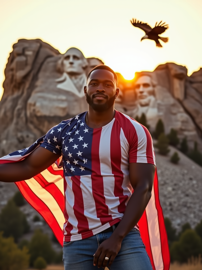 model in front of the iconic Mount Rushmore, wearing an American flag t-shirt and blue jeans, striking a proud pose with the American flag draped around his shoulders, golden hour lighting creating a warm, inspiring atmosphere, bald eagle soaring overhead