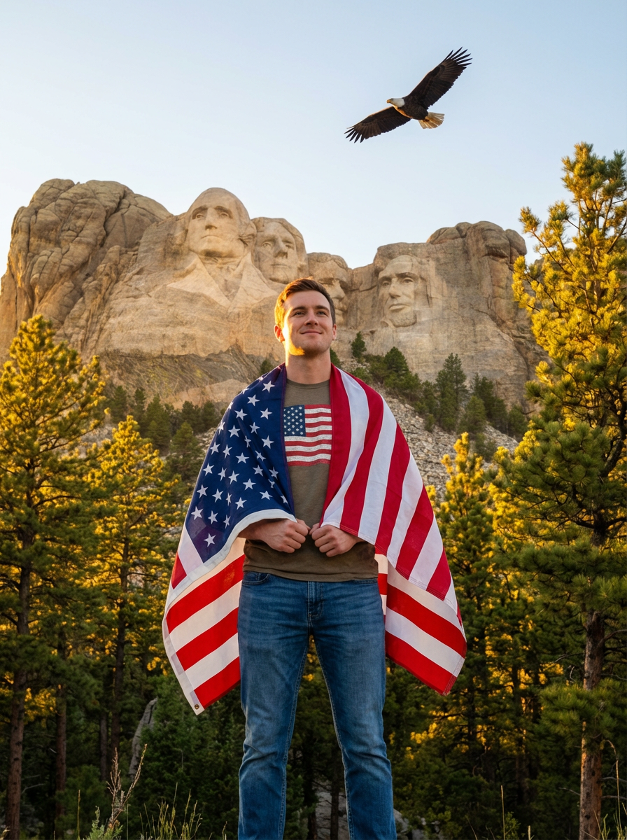 model in front of the iconic Mount Rushmore, wearing an American flag t-shirt and blue jeans, striking a proud pose with the American flag draped around his shoulders, golden hour lighting creating a warm, inspiring atmosphere, bald eagle soaring overhead