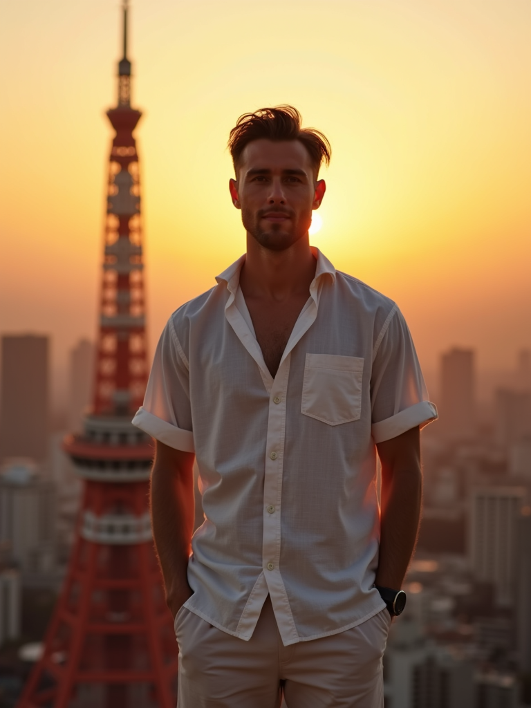 model in front of Tokyo Tower at sunset, wearing a light linen shirt and shorts, golden hour lighting