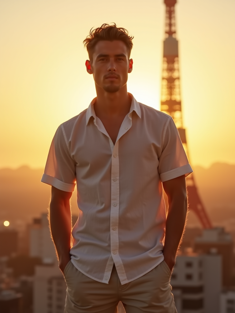 model in front of Tokyo Tower at sunset, wearing a light linen shirt and shorts, golden hour lighting