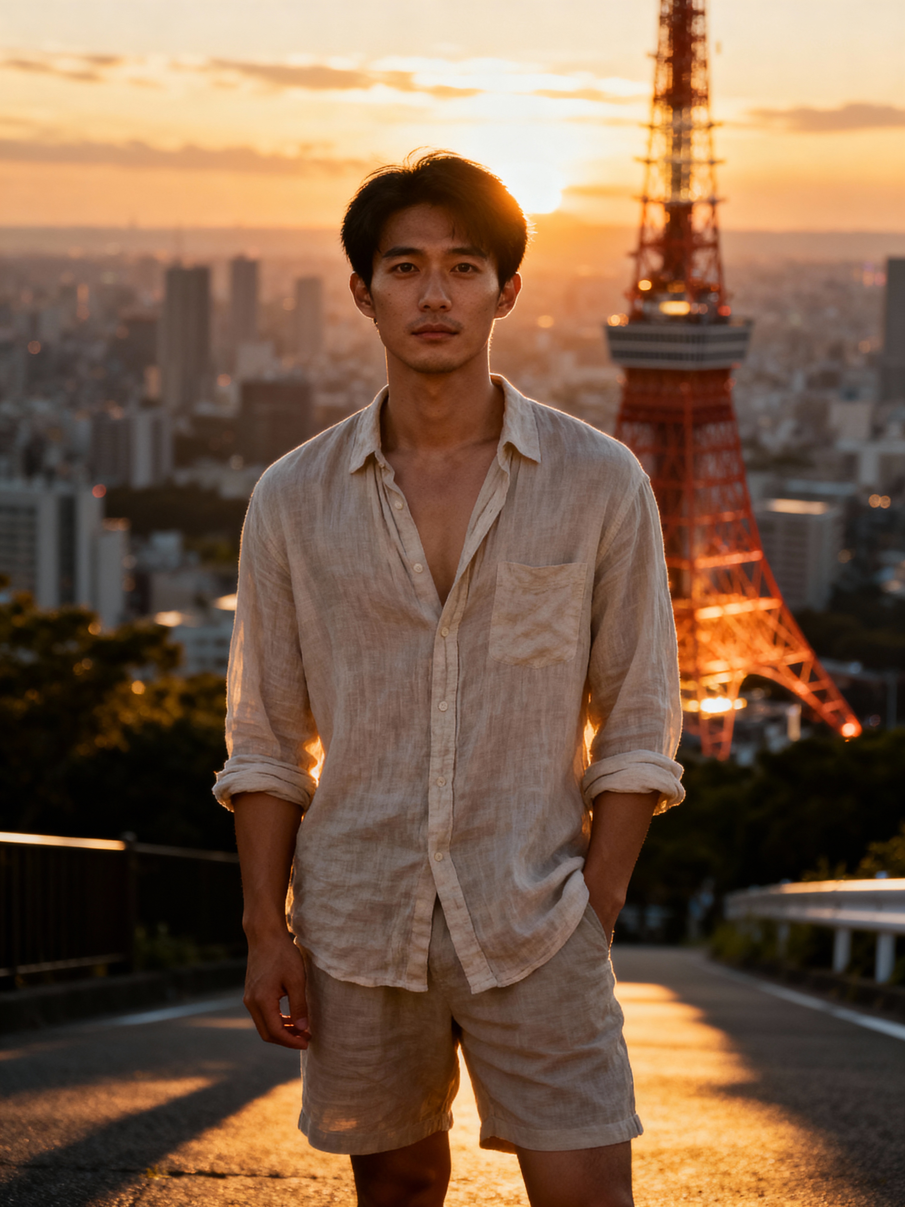 model in front of Tokyo Tower at sunset, wearing a light linen shirt and shorts, golden hour lighting