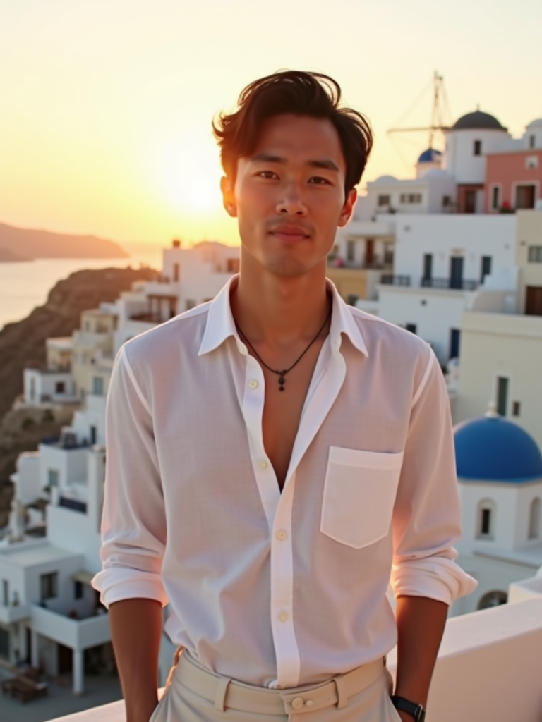 model in front of whitewashed Mykonos buildings at sunset, wearing a crisp white linen shirt with light pants, warm golden hour lighting