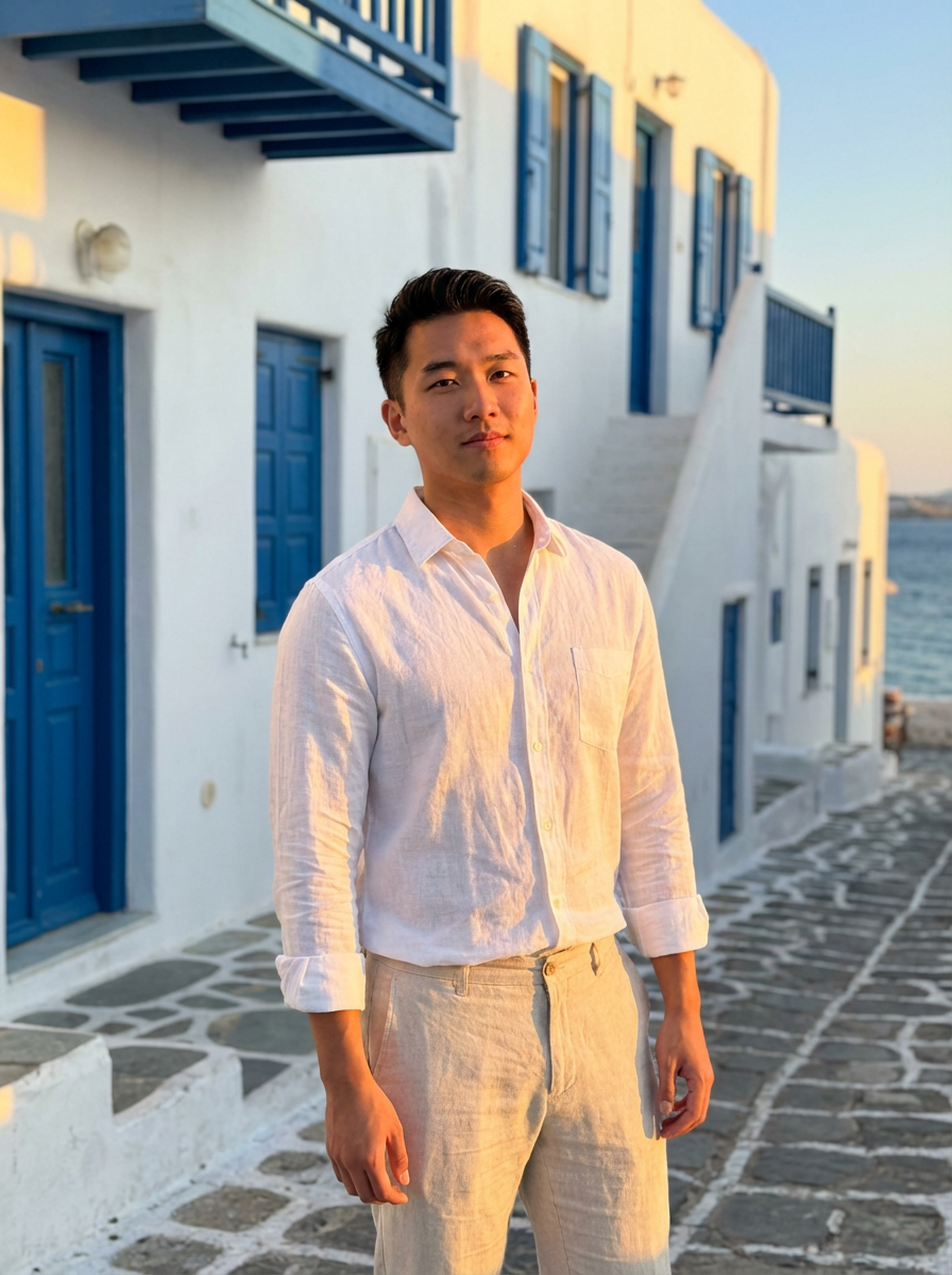 model in front of whitewashed Mykonos buildings at sunset, wearing a crisp white linen shirt with light pants, warm golden hour lighting