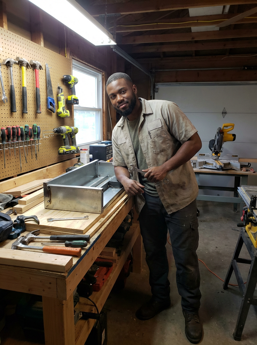 model in garage workshop, DIY project, tools visible, casual work clothes, productive moment