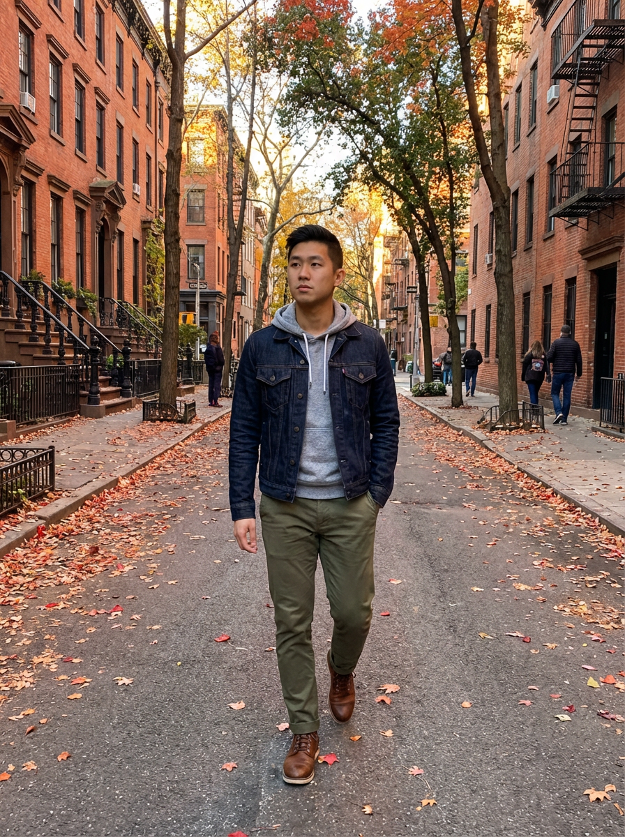 model in Greenwich Village, tree-lined street, brownstones, casual NYC style, autumn afternoon