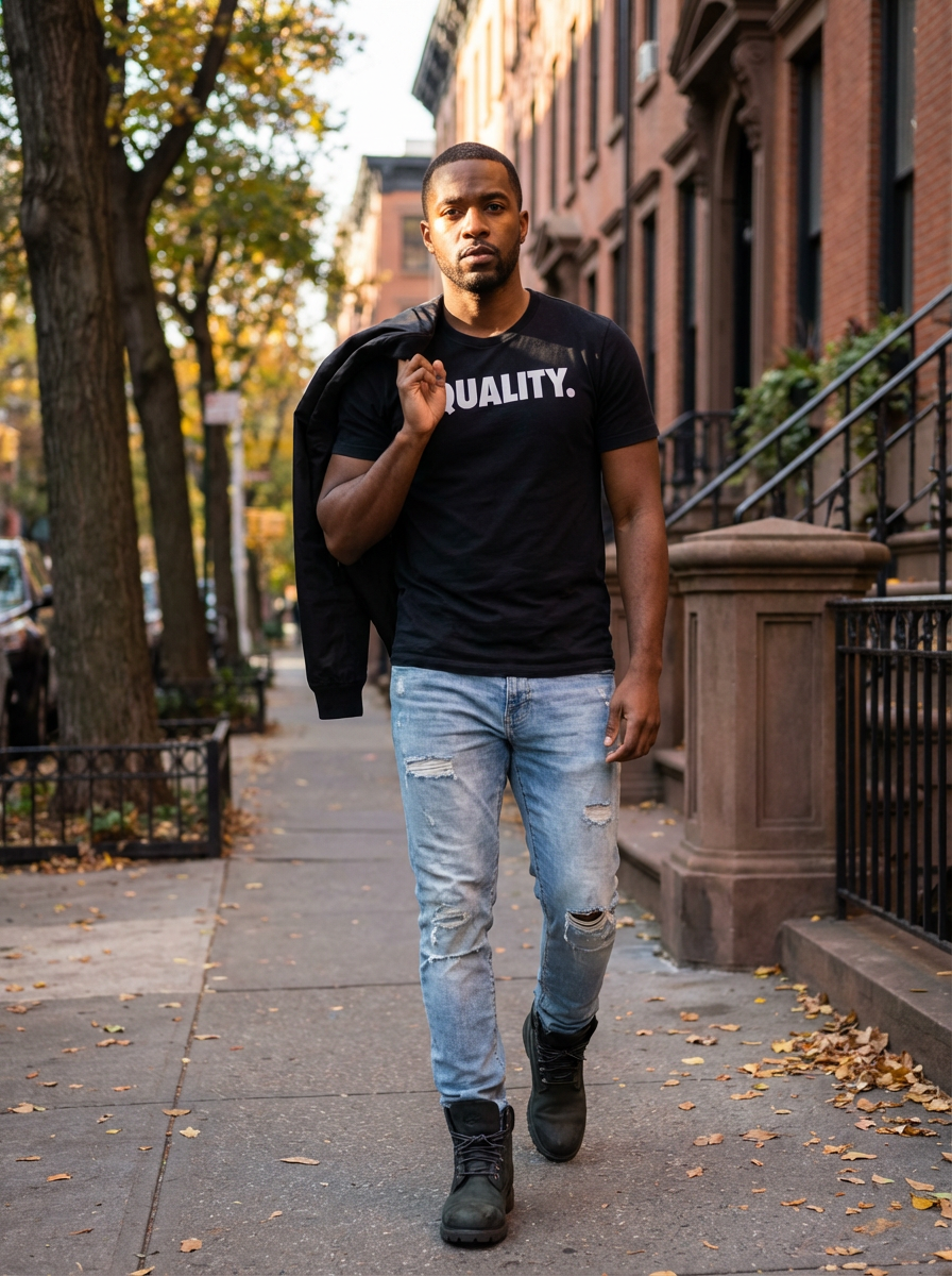 model in Greenwich Village, tree-lined street, brownstones, casual NYC style, autumn afternoon