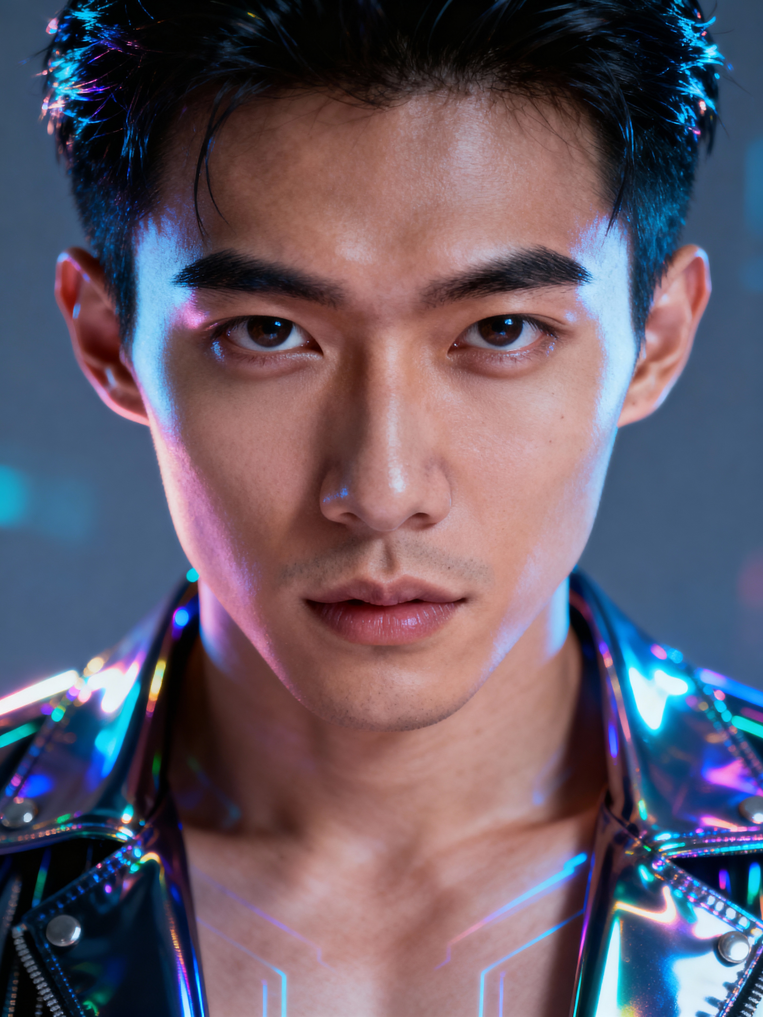 model in holographic style, wearing shiny glossy holographic fashion