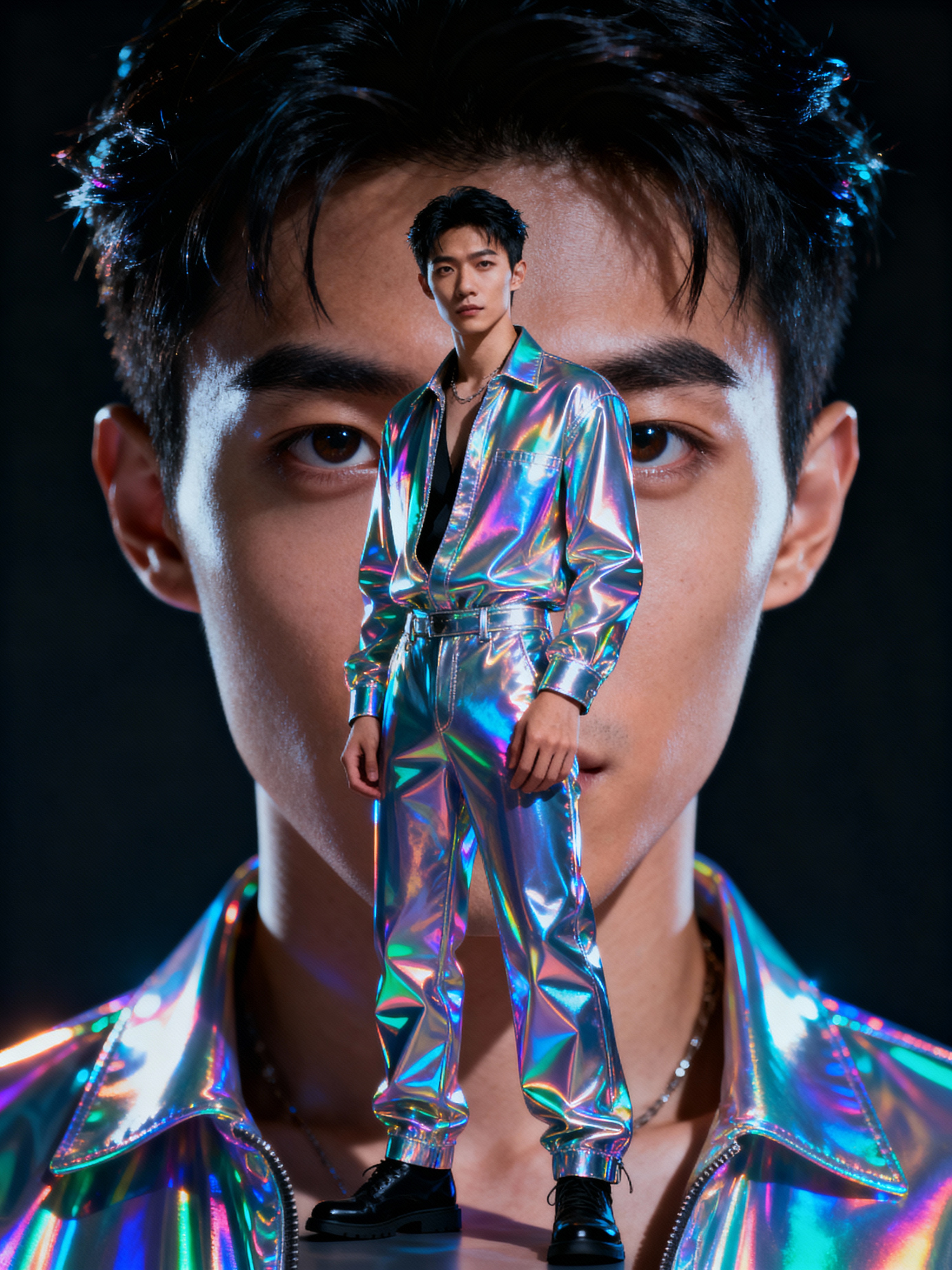 model in holographic style, wearing shiny glossy holographic fashion