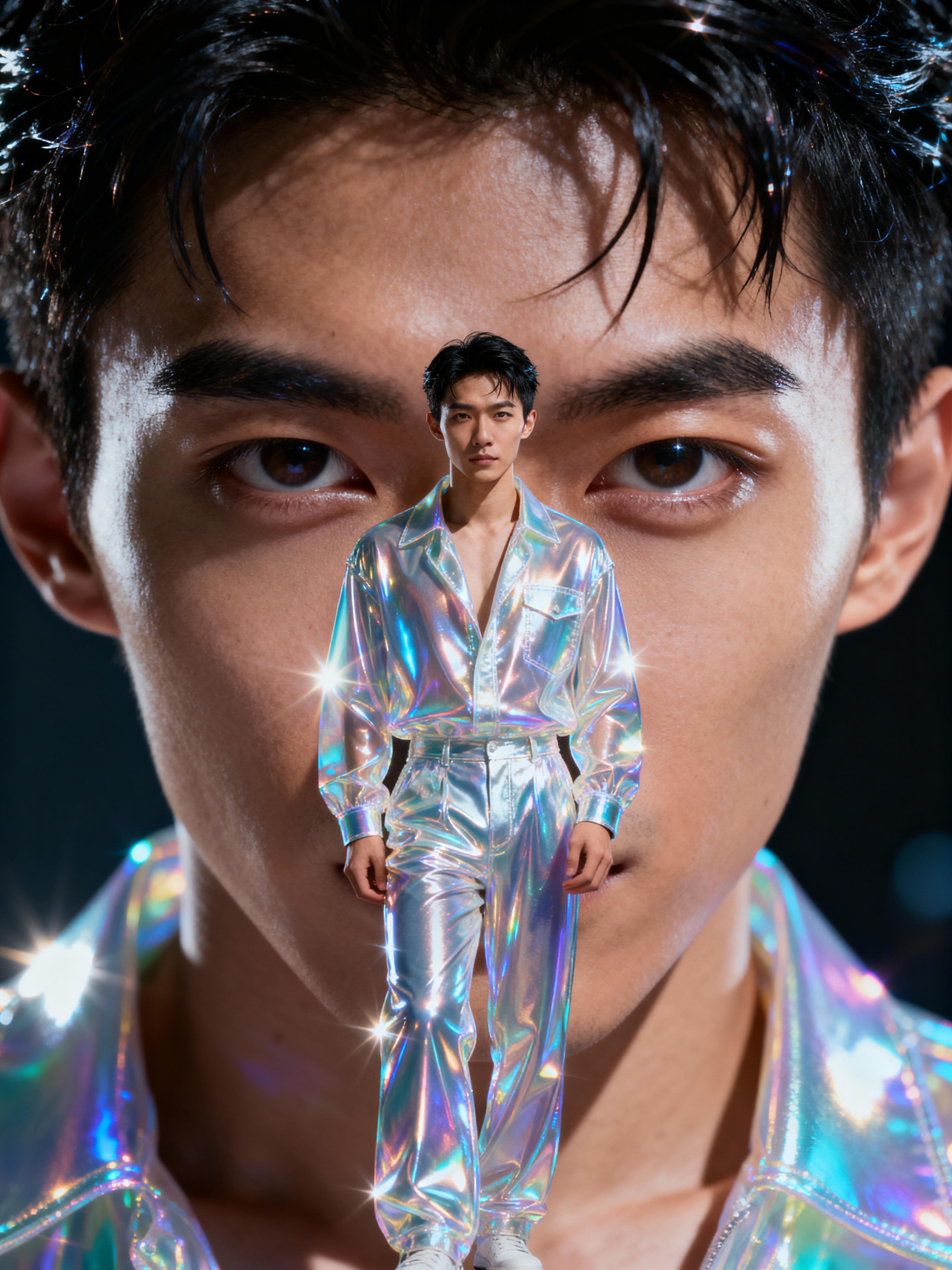 model in holographic style, wearing shiny glossy holographic fashion