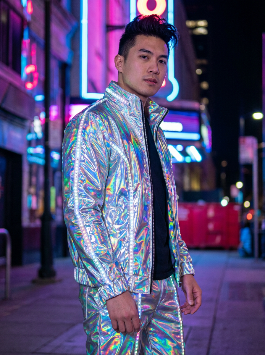 model in holographic style, wearing shiny glossy holographic fashion