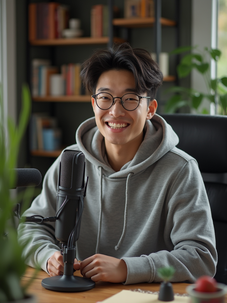 model in home podcast studio, wearing comfortable hoodie, desk microphone setup, books and plants in background, natural lighting, approachable aesthetic