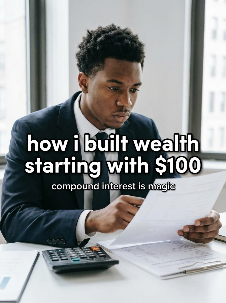 model in investment meeting attire at desk with financial documents and calculator, focused expression, professional lighting. TikTok text overlay: "how i built wealth starting with $100" smaller text: "(compound interest is magic)", do not show tiktok interface