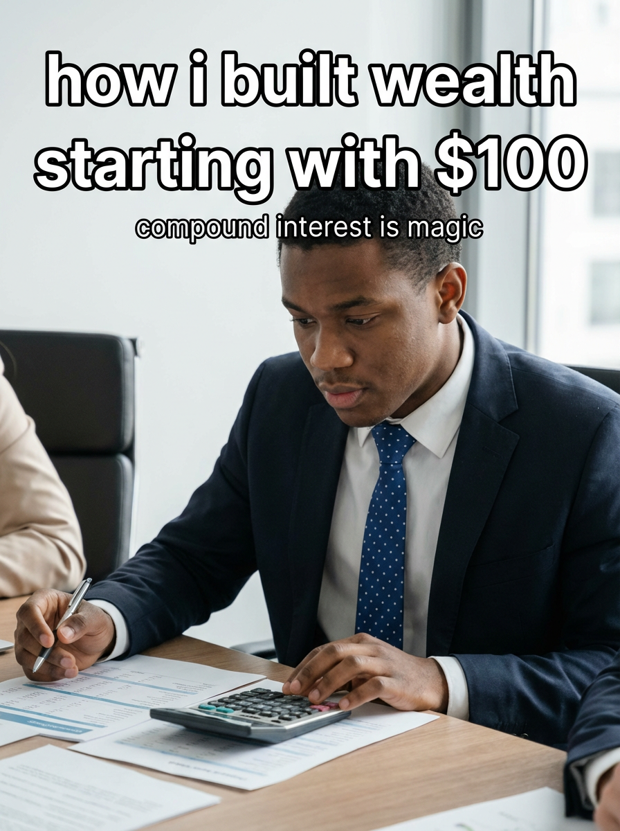 model in investment meeting attire at desk with financial documents and calculator, focused expression, professional lighting. TikTok-style text overlay with white text with black outline: "how i built wealth starting with $100" smaller text: "(compound interest is magic)", do not show tiktok interface or logo
