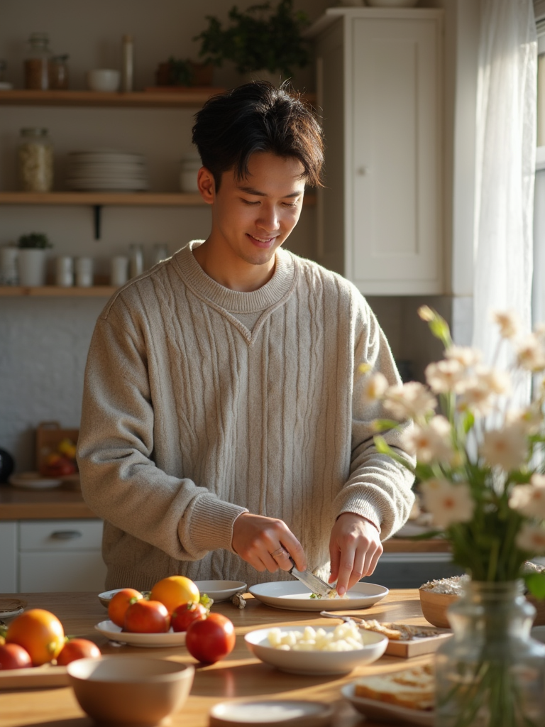 model in kitchen making breakfast, wearing comfortable sweater, fresh ingredients and flowers on counter, soft morning light, slow living aesthetic