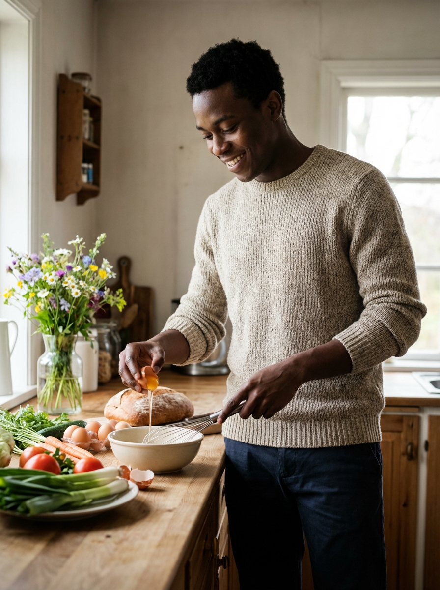 model in kitchen making breakfast, wearing comfortable sweater, fresh ingredients and flowers on counter, soft morning light, slow living aesthetic