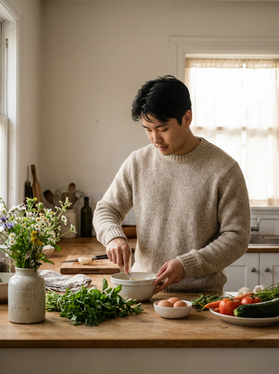 model in kitchen making breakfast, wearing comfortable sweater, fresh ingredients and flowers on counter, soft morning light, slow living aesthetic