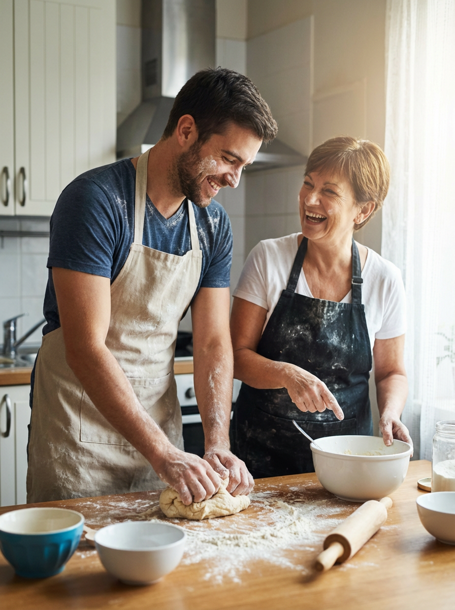 model in kitchen with mom, baking together, flour-dusted aprons, warm family moment
