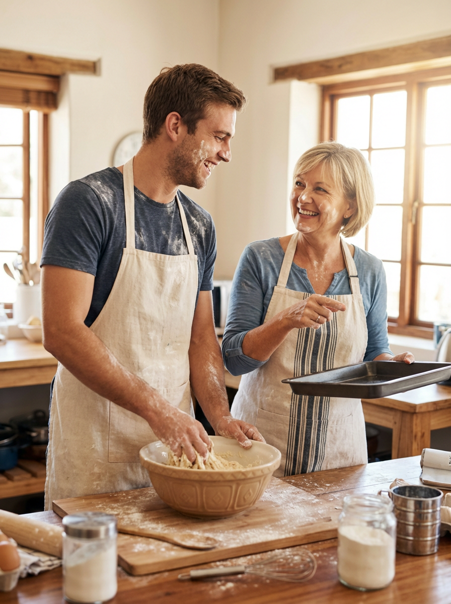 model in kitchen with mom, baking together, flour-dusted aprons, warm family moment