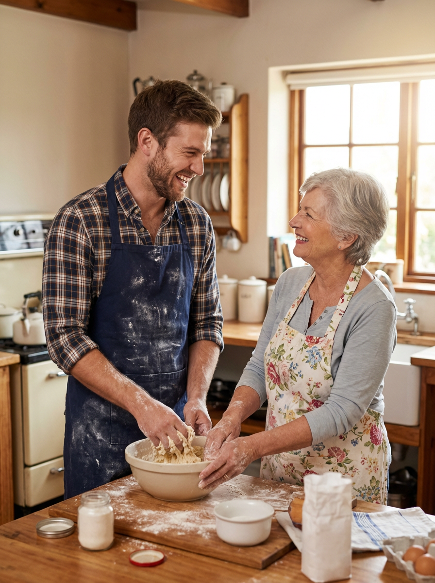 model in kitchen with mom, baking together, flour-dusted aprons, warm family moment