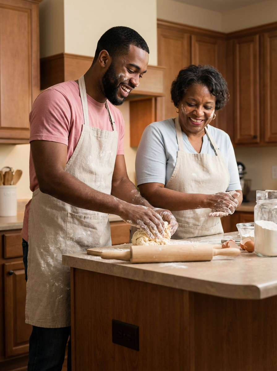 model in kitchen with mom, baking together, flour-dusted aprons, warm family moment
