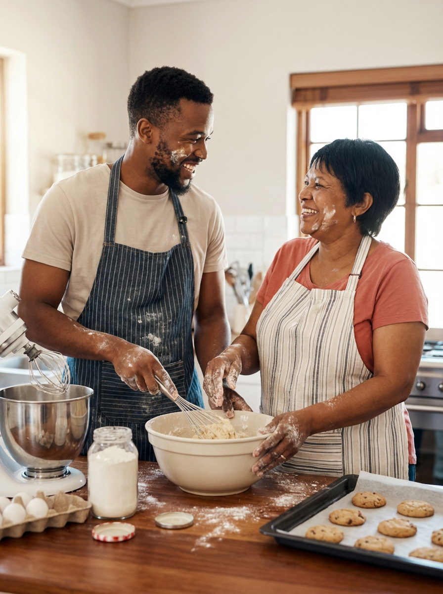 model in kitchen with mom, baking together, flour-dusted aprons, warm family moment