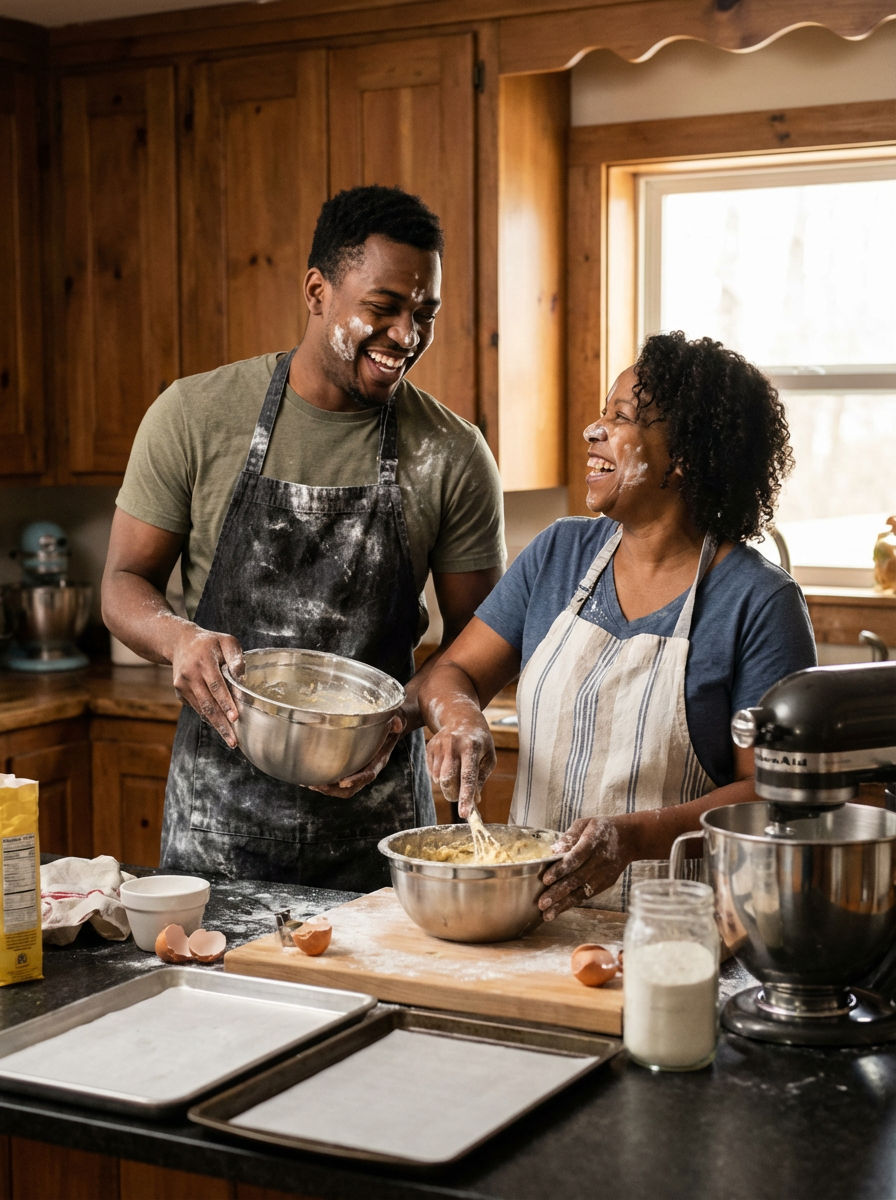 model in kitchen with mom, baking together, flour-dusted aprons, warm family moment