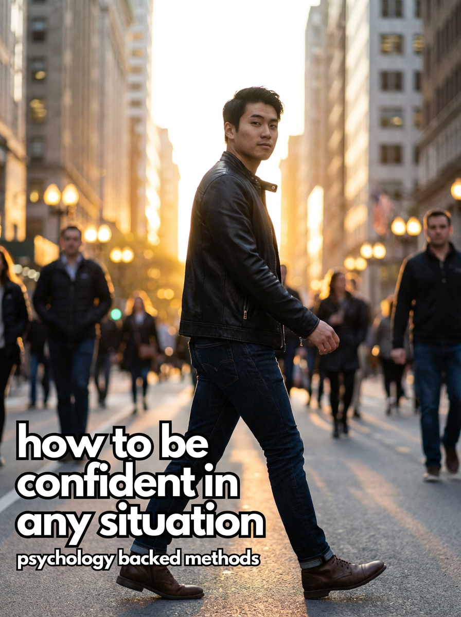model in leather jacket and jeans walking through busy city street, confident stride, urban backdrop, golden hour lighting. TikTok TikTok-style text overlay with white text with black outline: "how to be confident in any situation" smaller text: "(psychology backed methods)", do not show tiktok interface or logo