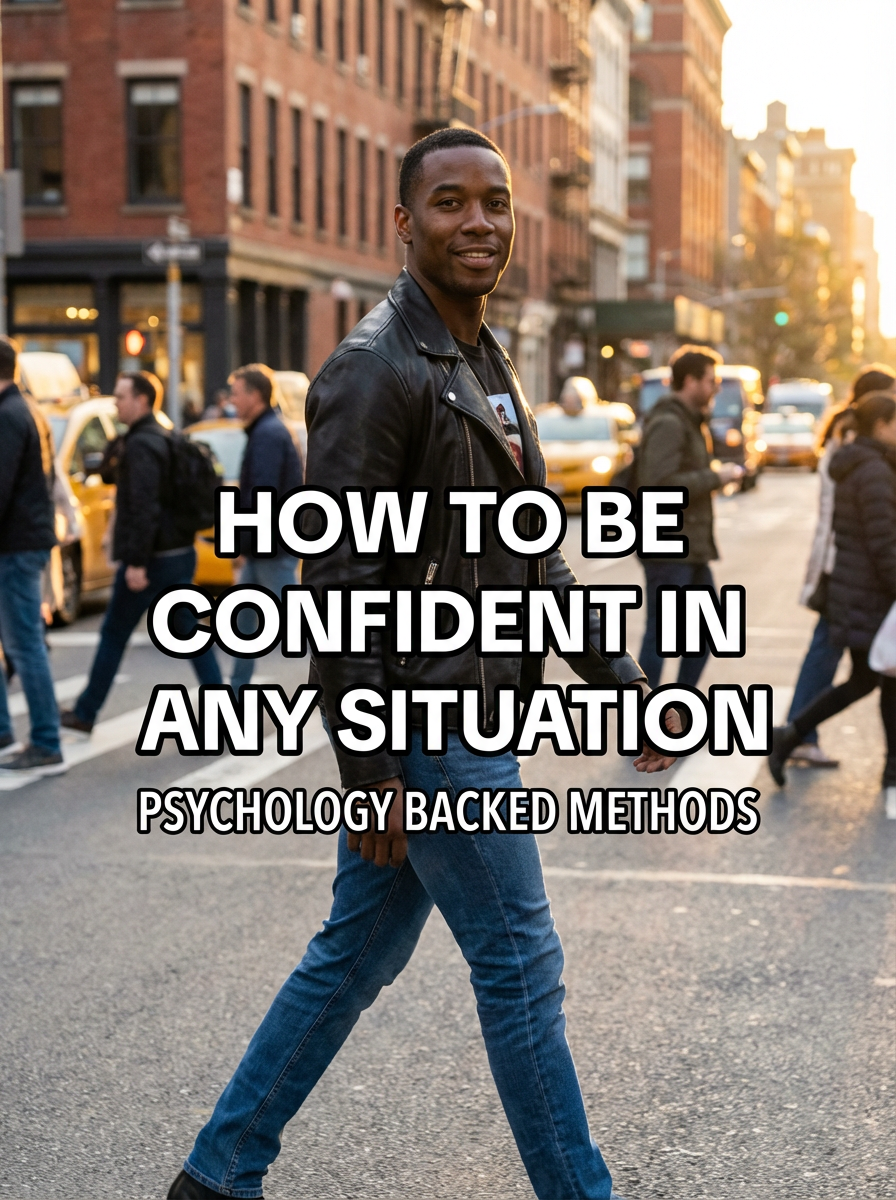model in leather jacket and jeans walking through busy city street, confident stride, urban backdrop, golden hour lighting. TikTok TikTok-style text overlay with white text with black outline: "how to be confident in any situation" smaller text: "(psychology backed methods)", do not show tiktok interface or logo