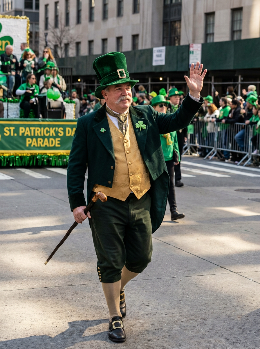 model in leprechaun inspired outfit, green hat, festive costume elements, parade setting