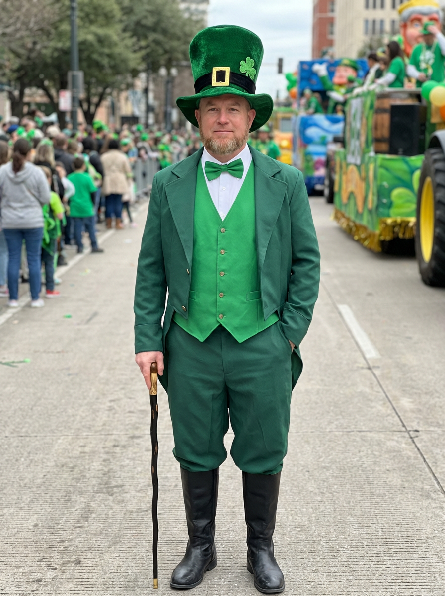 model in leprechaun inspired outfit, green hat, festive costume elements, parade setting