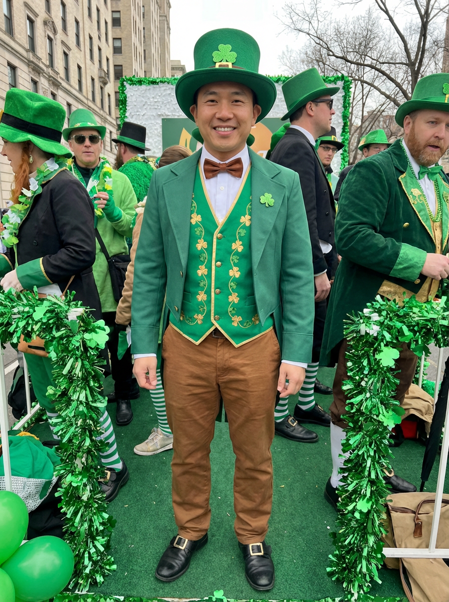 model in leprechaun inspired outfit, green hat, festive costume elements, parade setting
