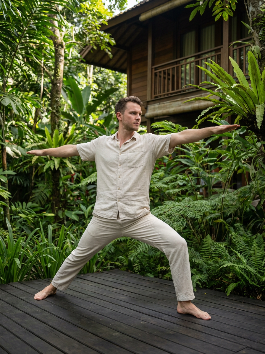 model in light linen outfit doing yoga pose on wooden deck of jungle villa, surrounded by tropical foliage