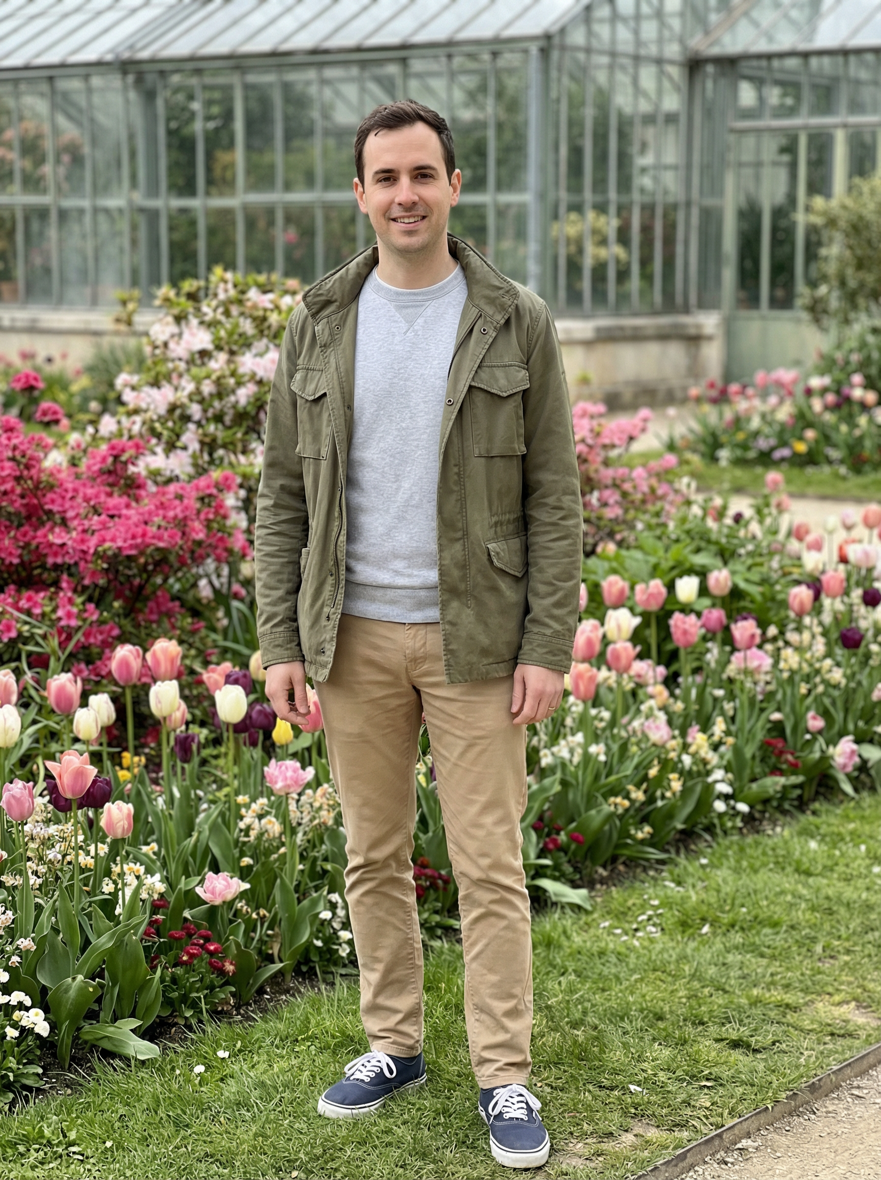 model in light sweater, chinos, canvas shoes, casual jacket in Jardin des Plantes botanical garden, blooming flowers everywhere, greenhouse in background, spring garden beauty, natural lighting, botanical paradise
