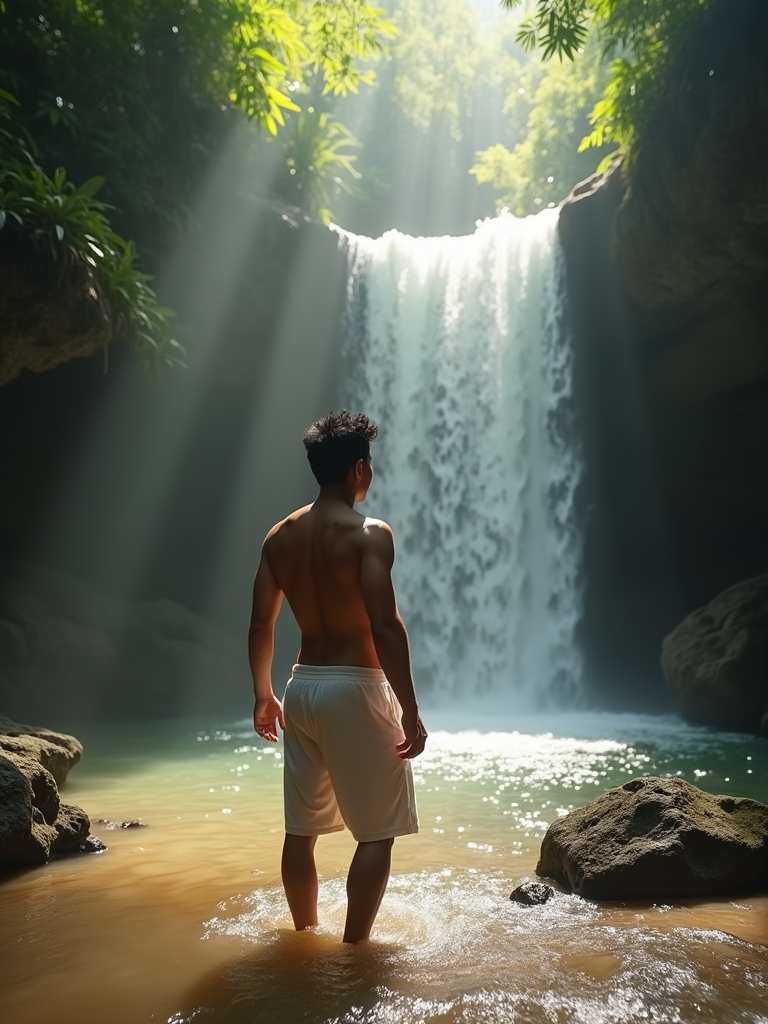model in linen beach wear exploring hidden waterfall in jungle, rays of light streaming down