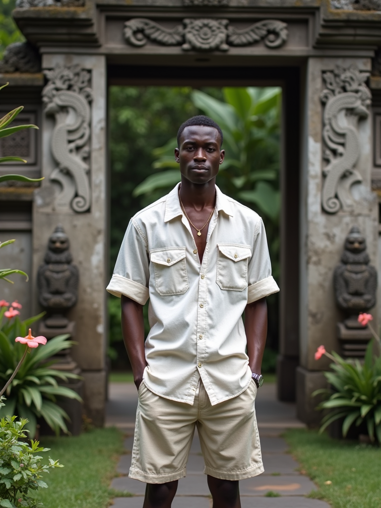 model in linen shirt and shorts standing in front of traditional Balinese temple gate with intricate stone carvings, lush tropical plants and flowers in background