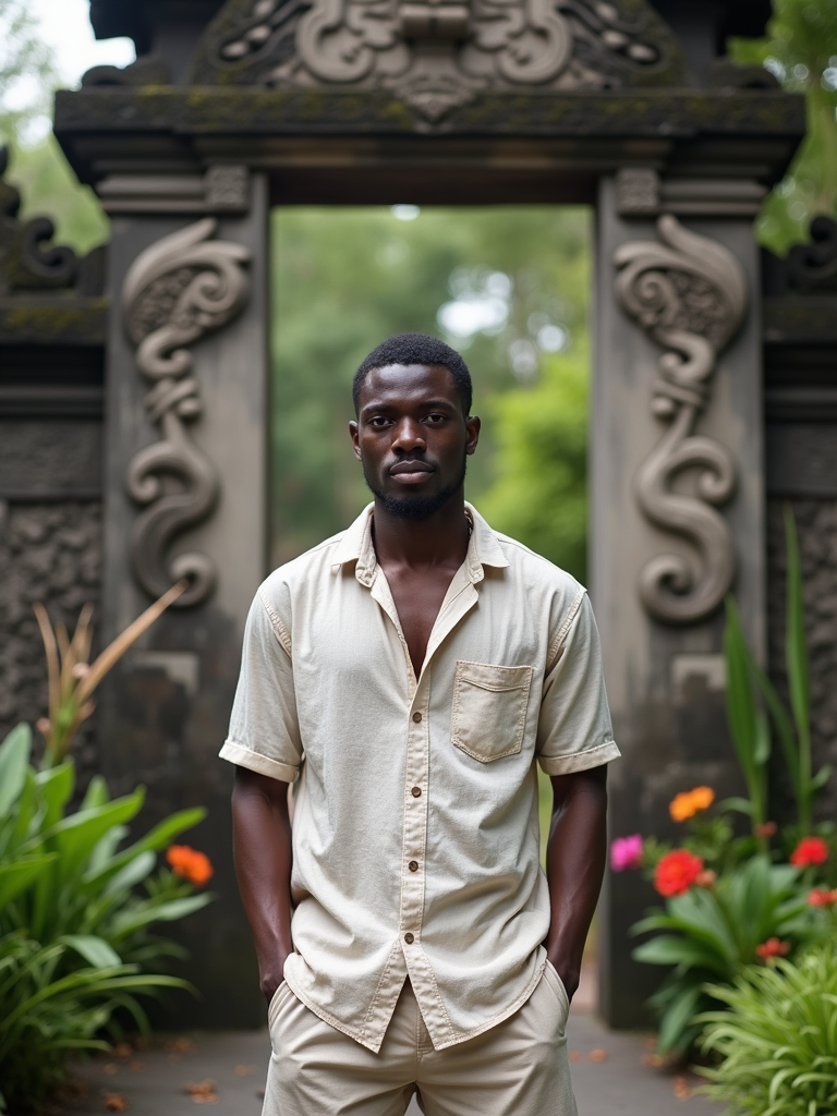 model in linen shirt and shorts standing in front of traditional Balinese temple gate with intricate stone carvings, lush tropical plants and flowers in background