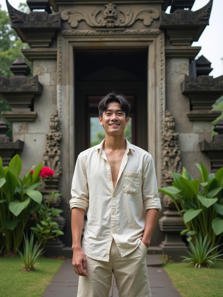 model in linen shirt and shorts standing in front of traditional Balinese temple gate with intricate stone carvings, lush tropical plants and flowers in background
