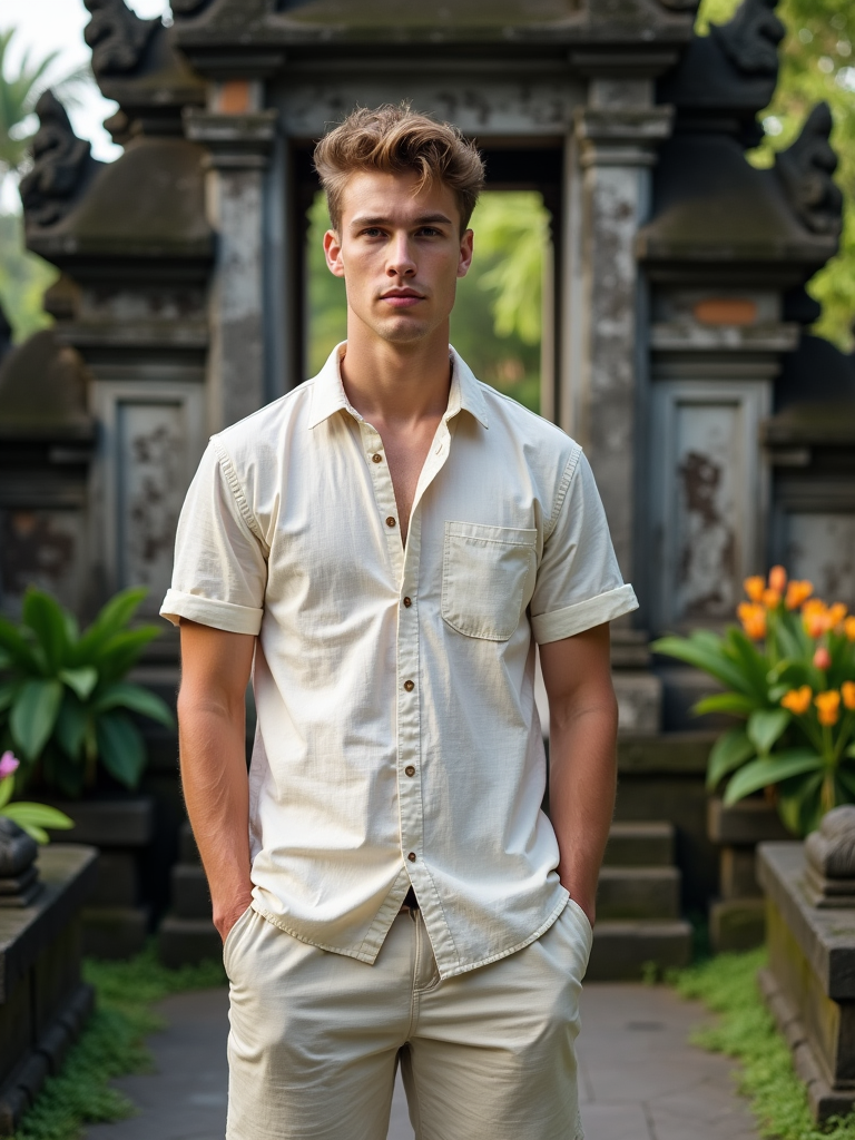 model in linen shirt and shorts standing in front of traditional Balinese temple gate with intricate stone carvings, lush tropical plants and flowers in background