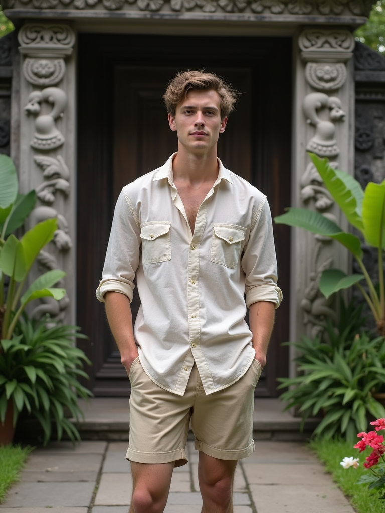 model in linen shirt and shorts standing in front of traditional Balinese temple gate with intricate stone carvings, lush tropical plants and flowers in background