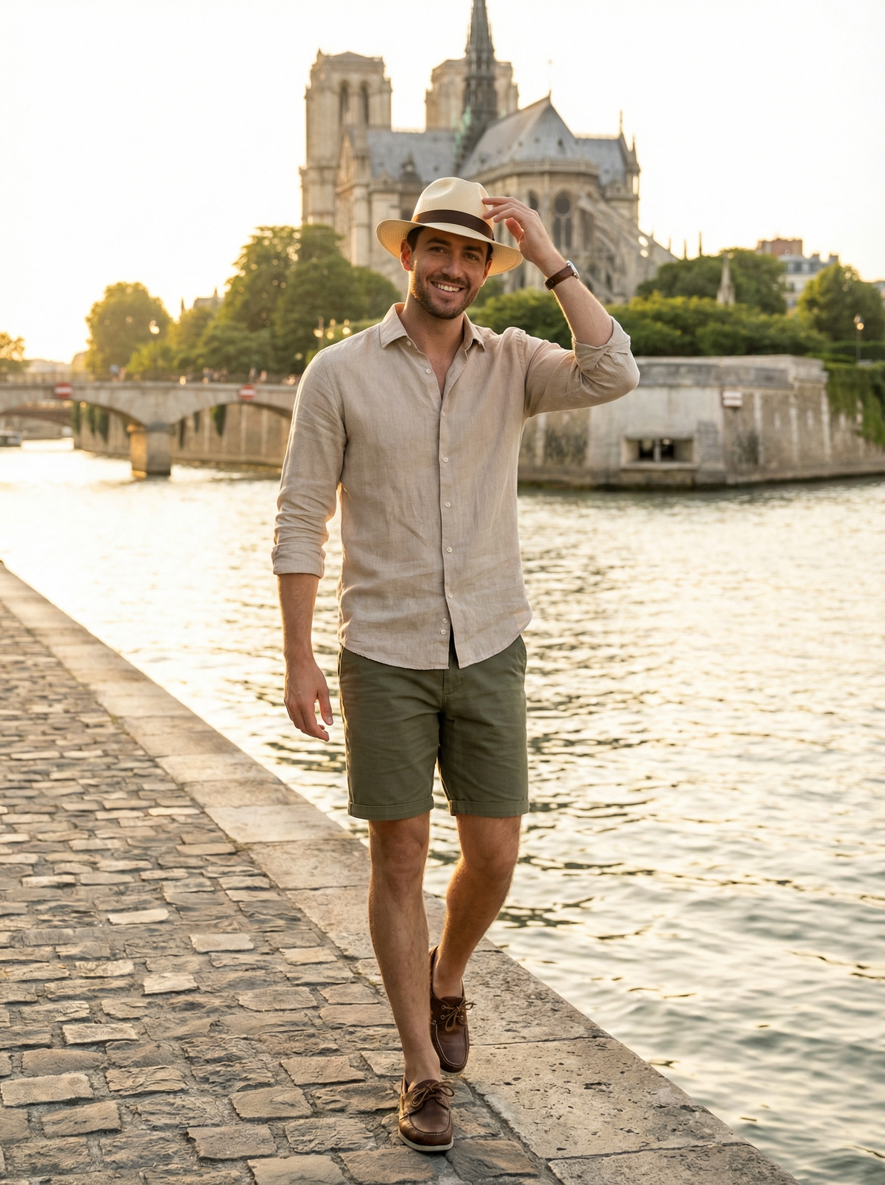model in linen shirt, shorts, boat shoes, panama hat strolling along the Seine riverbank with Notre-Dame in background, romantic riverside walk, golden afternoon light reflecting on water, classic Parisian architecture, leisurely tourist moment