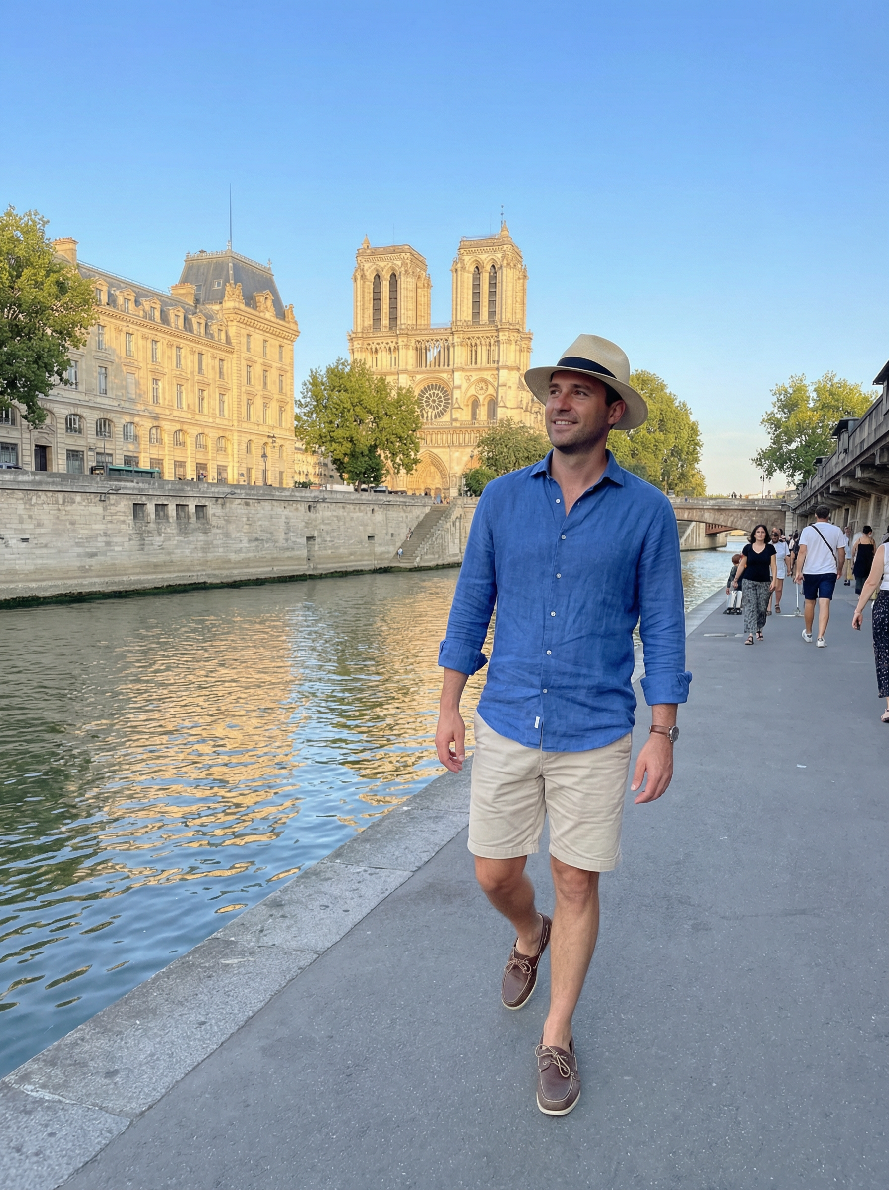 model in linen shirt, shorts, boat shoes, panama hat strolling along the Seine riverbank with Notre-Dame in background, romantic riverside walk, golden afternoon light reflecting on water, classic Parisian architecture, leisurely tourist moment