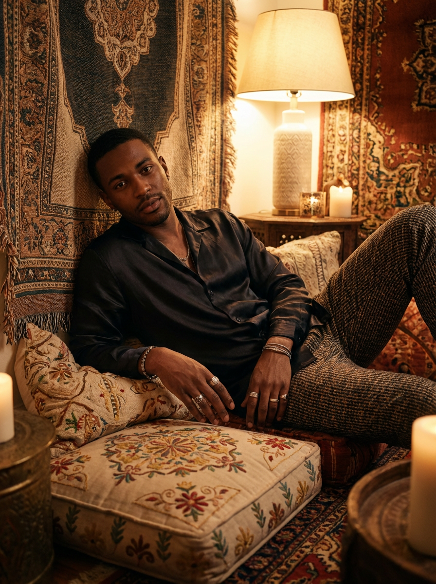 model in luxe bohemian setting, cushions and tapestries, relaxed sensual atmosphere