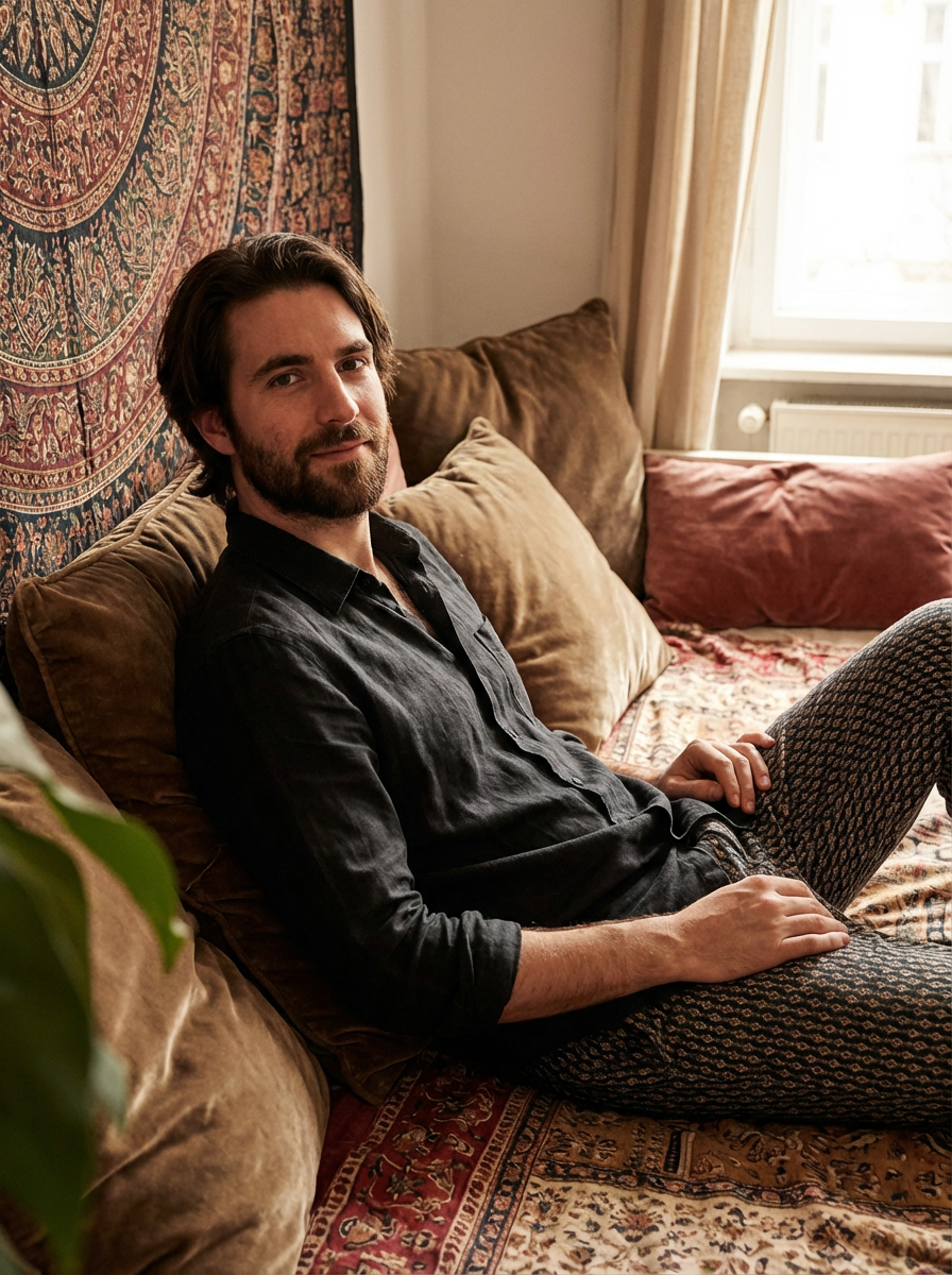 model in luxe bohemian setting, cushions and tapestries, relaxed sensual atmosphere