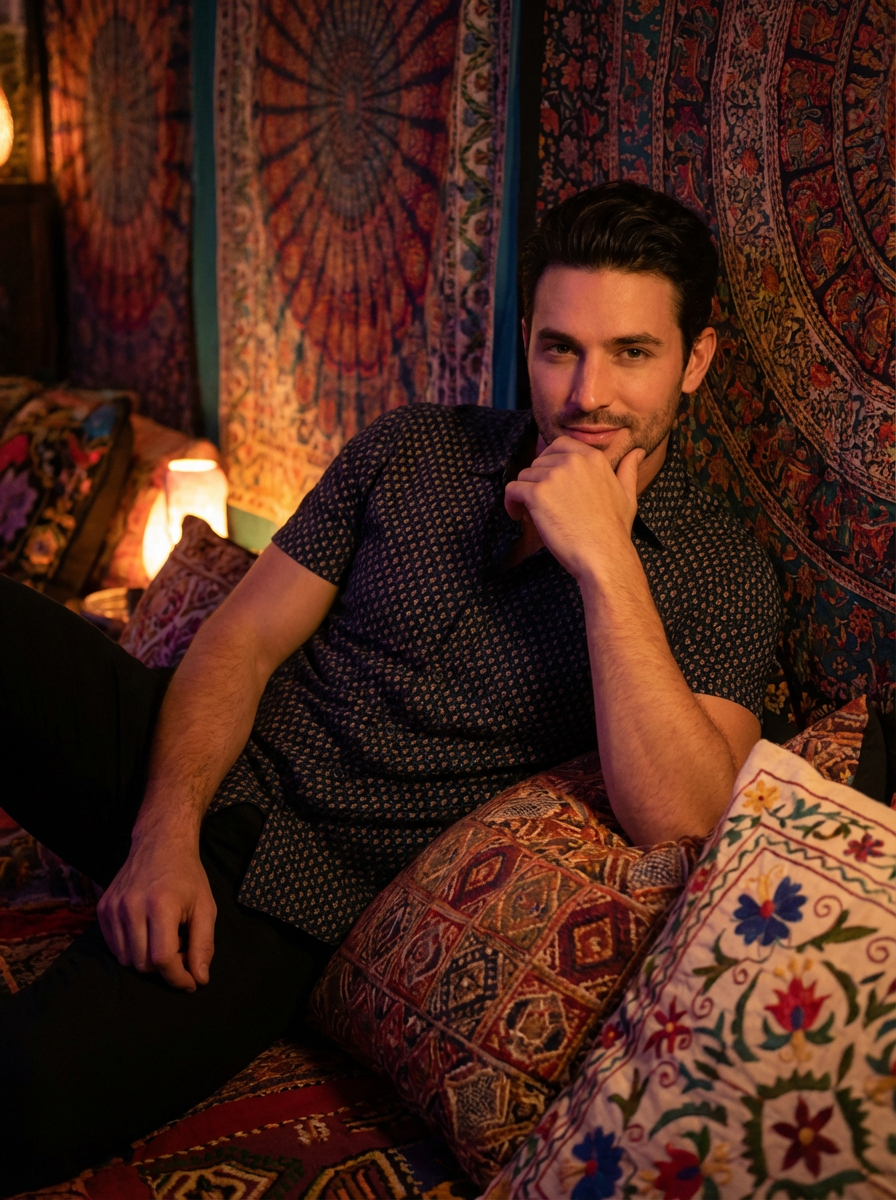 model in luxe bohemian setting, cushions and tapestries, relaxed sensual atmosphere