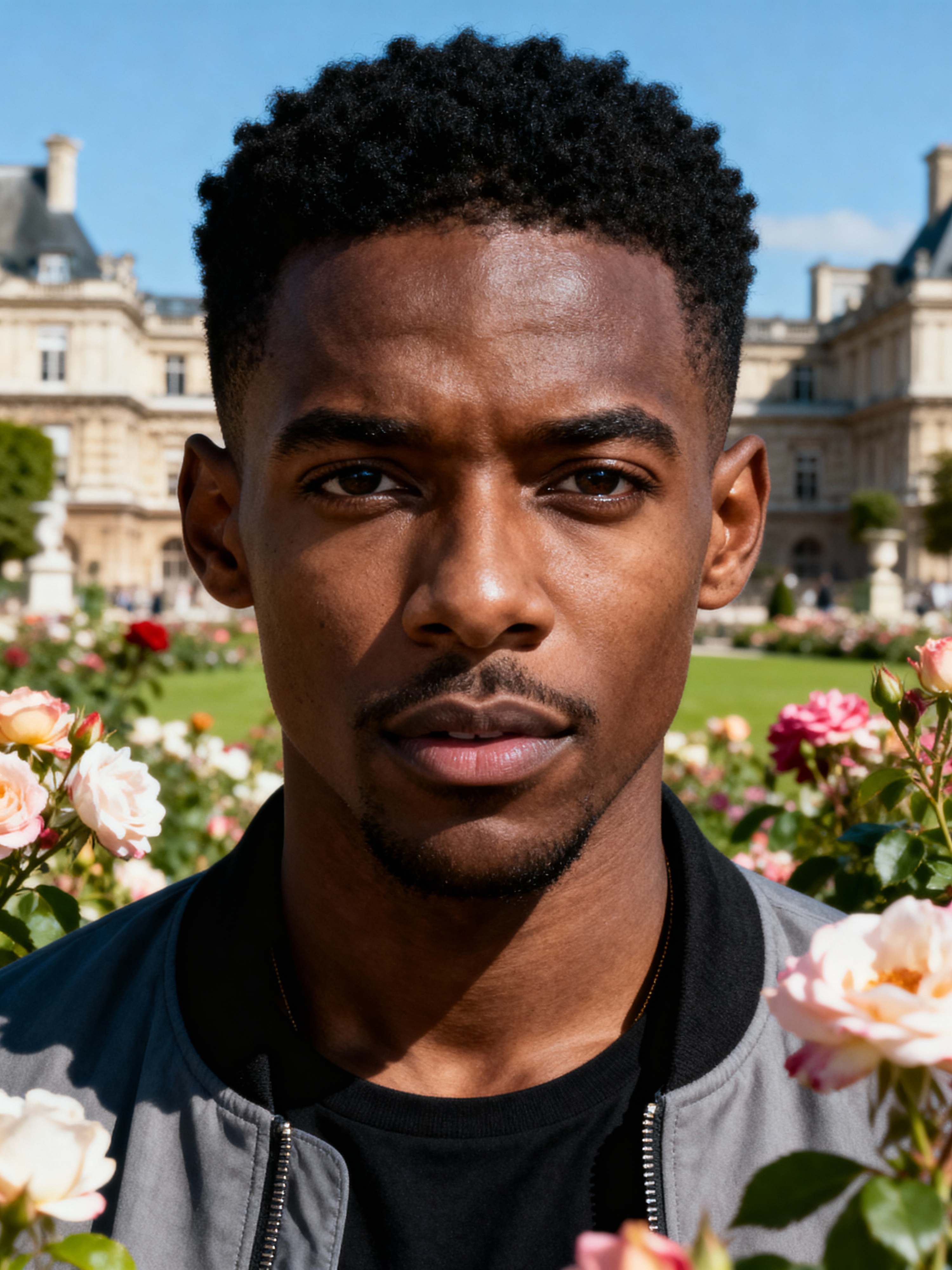 model in Luxembourg Gardens, wearing a modern casual outfit, surrounded by blooming flowers