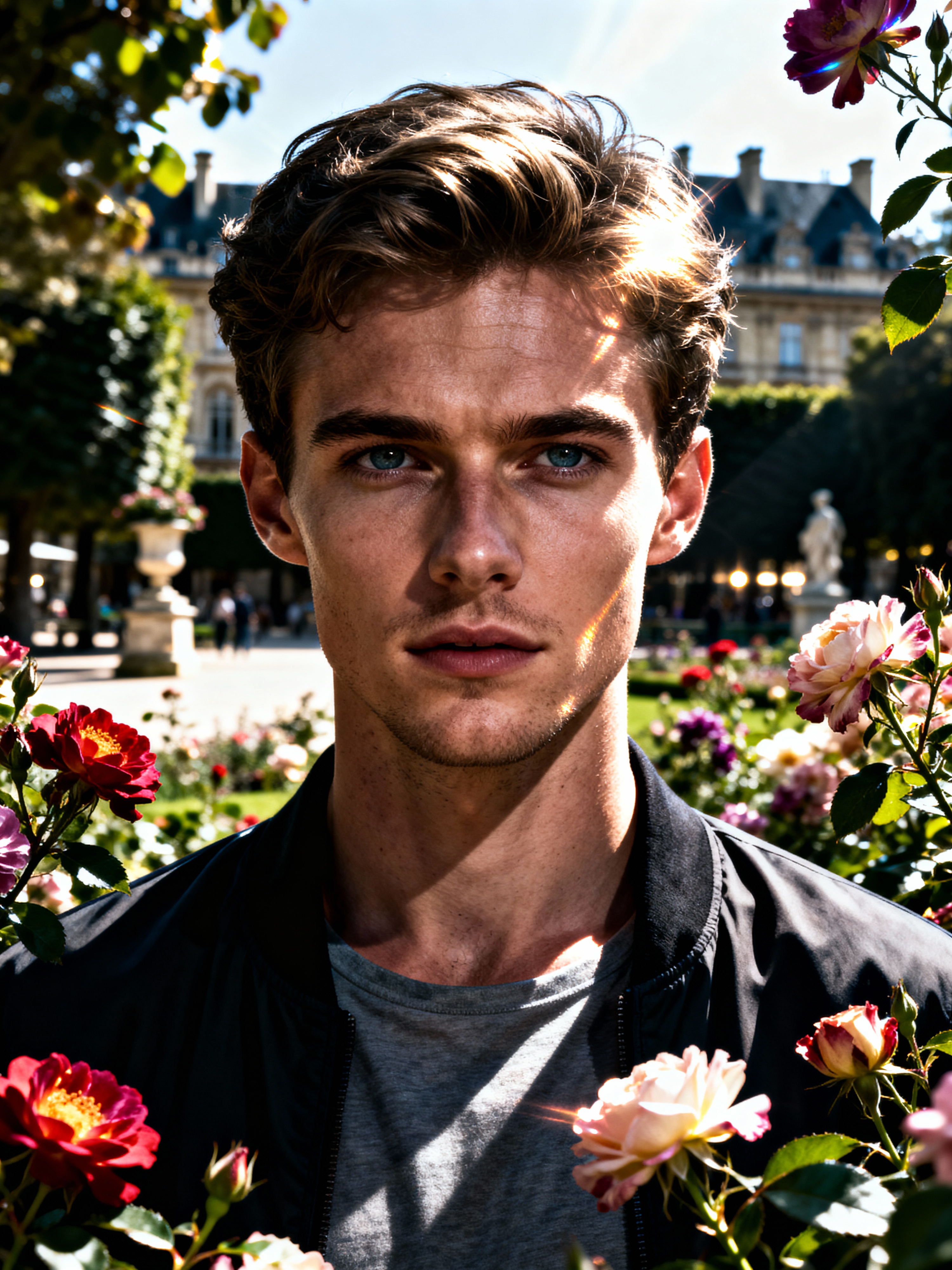 model in Luxembourg Gardens, wearing a modern casual outfit, surrounded by blooming flowers