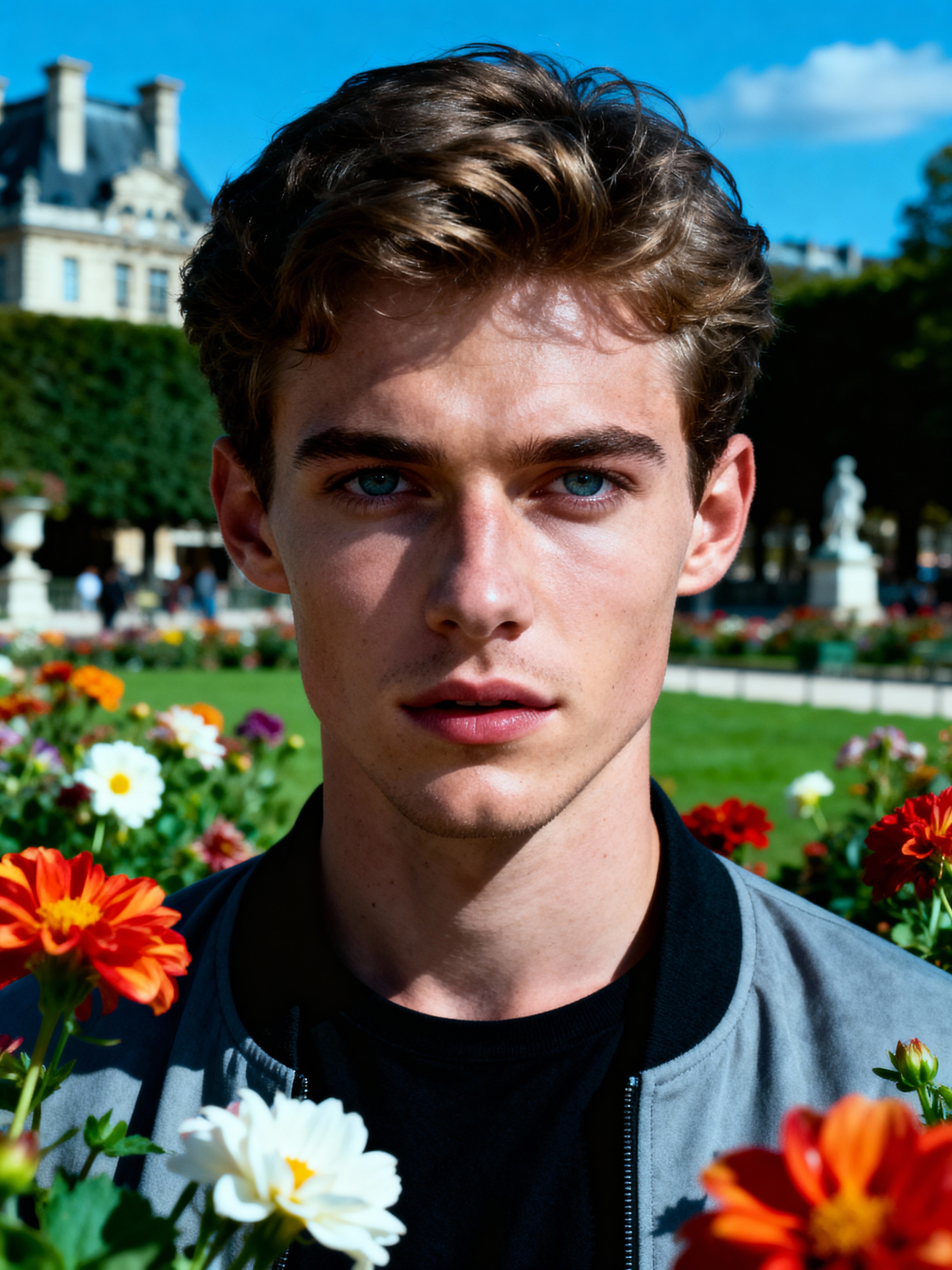 model in Luxembourg Gardens, wearing a modern casual outfit, surrounded by blooming flowers